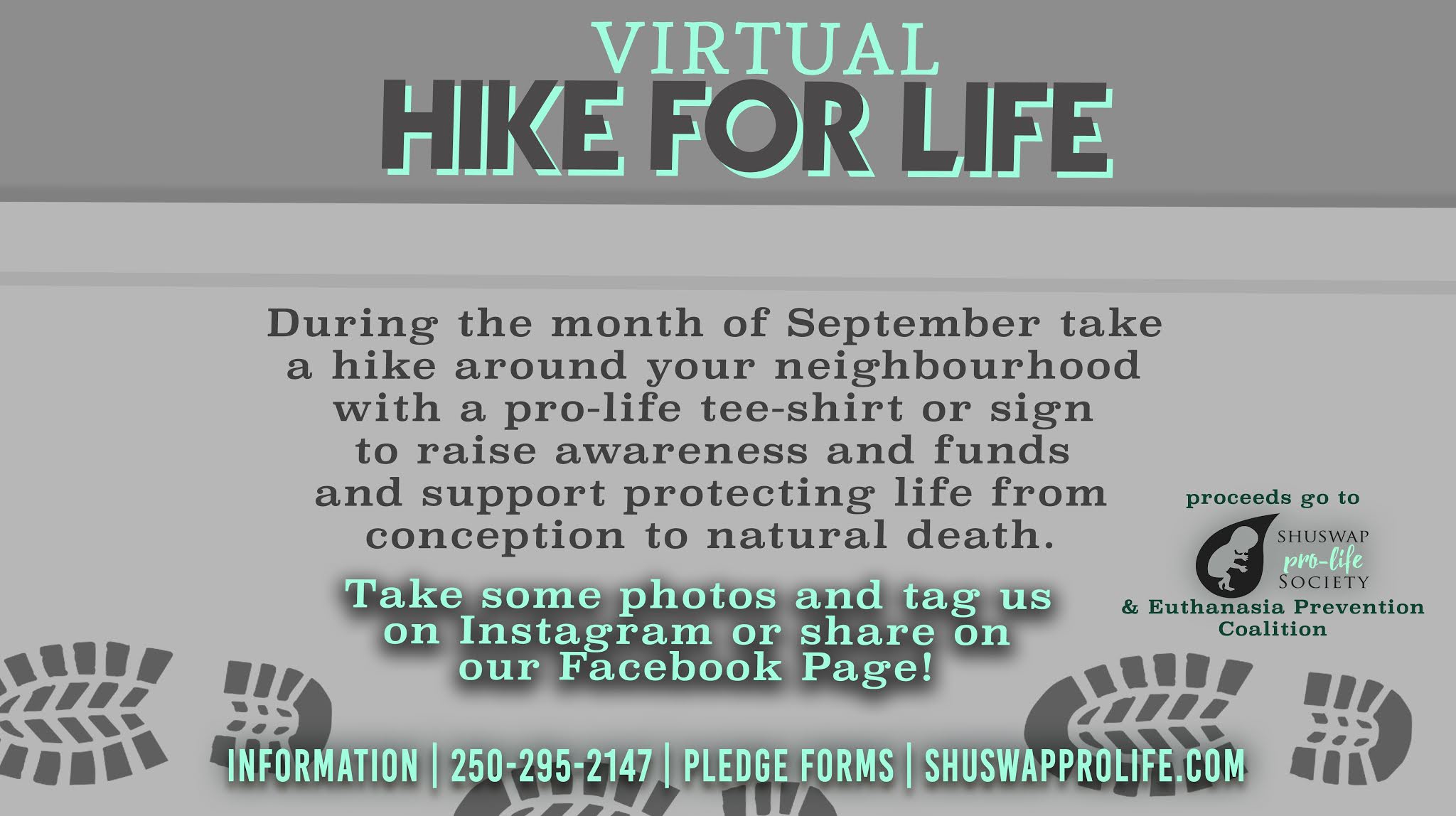 You may have attended the Hike for Life in Salmon Arm the last few years where we were gaining momentum with doughnuts, coffee, balloons and signs in an effort to make it a family friendly awareness for the sanctity of life! As every other email you have received this year, we are going to try doing this "virtually", as to avoid any bad light being shone on the pro-life society of Salmon Arm during Covid.